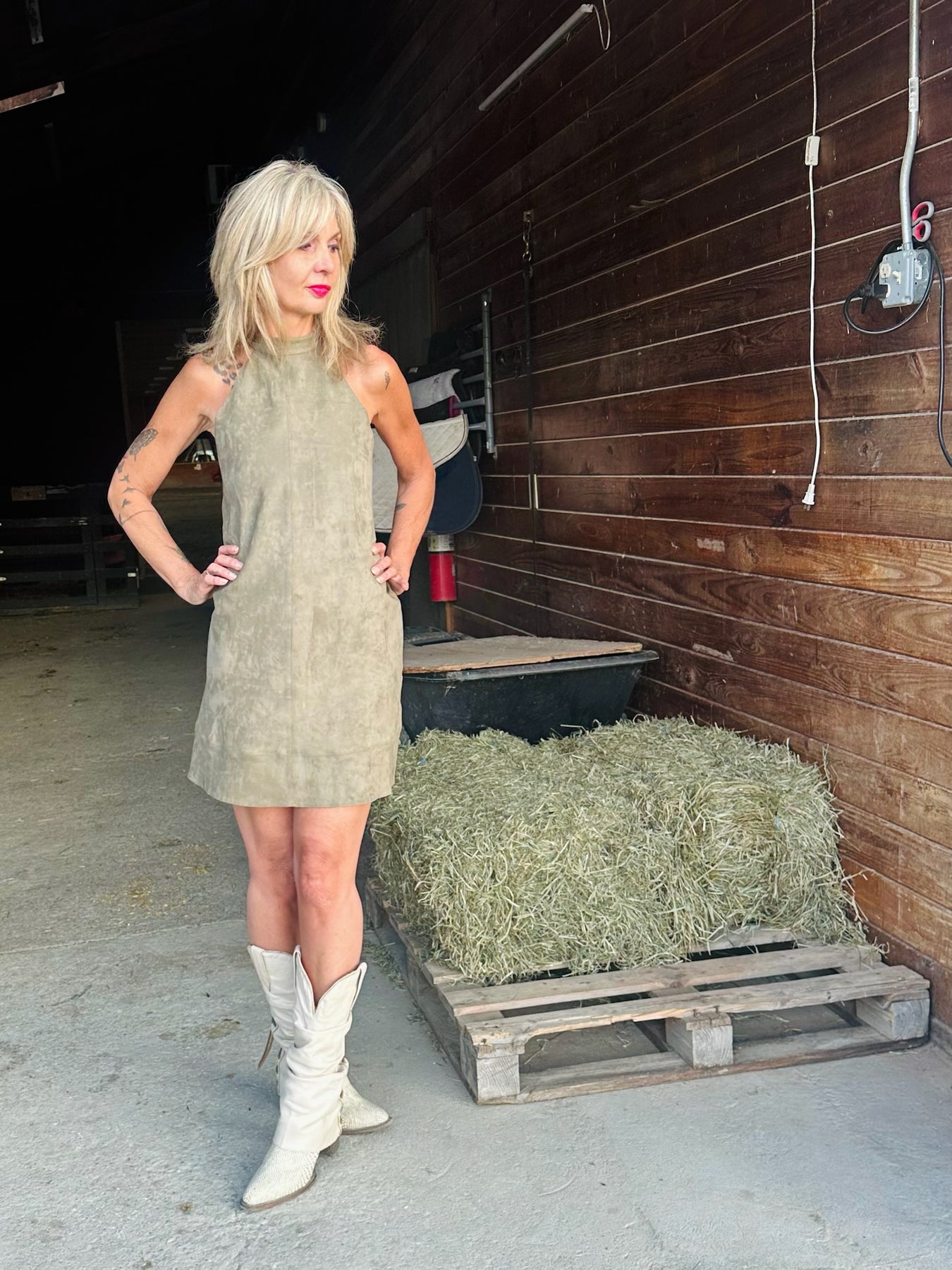 This Dress exudes sophistication and style, with its sleek design and plush faux suede fabric. The mock neck adds a contemporary touch to this classic shift dress, making it a versatile choice for both professional and casual settings.