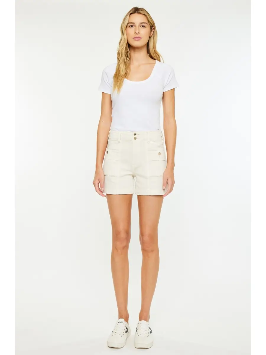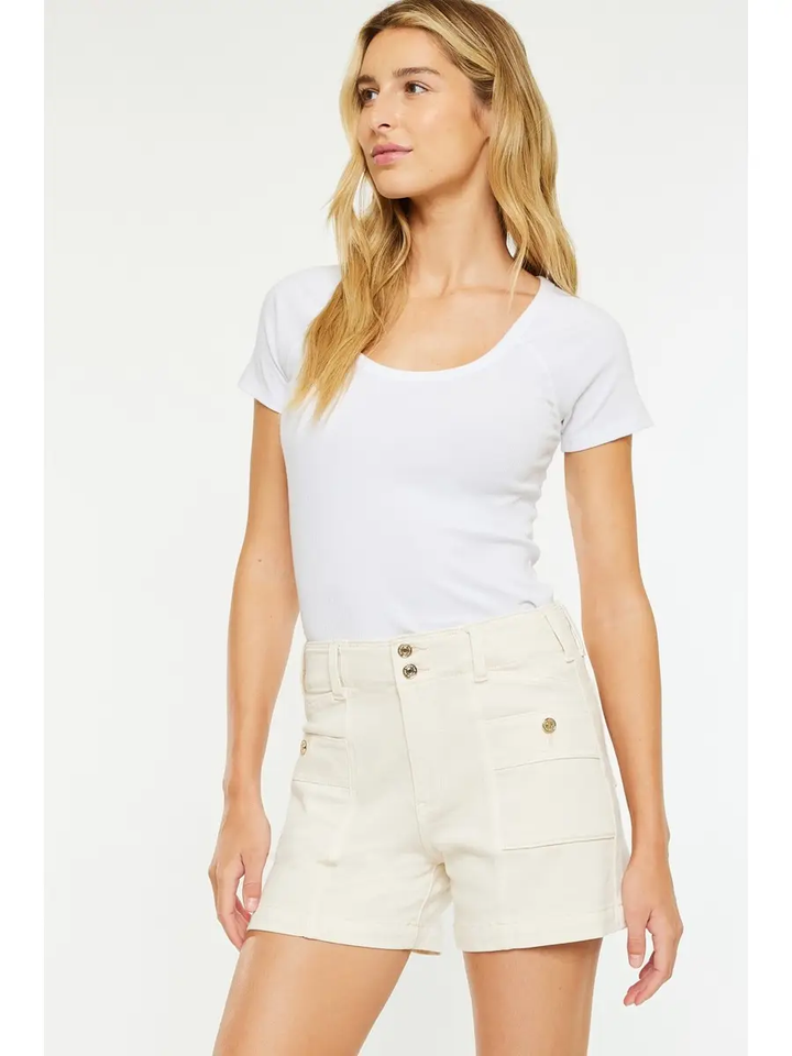 High Rise Denim Cream Shorts with stretch, double button and zipper fly.