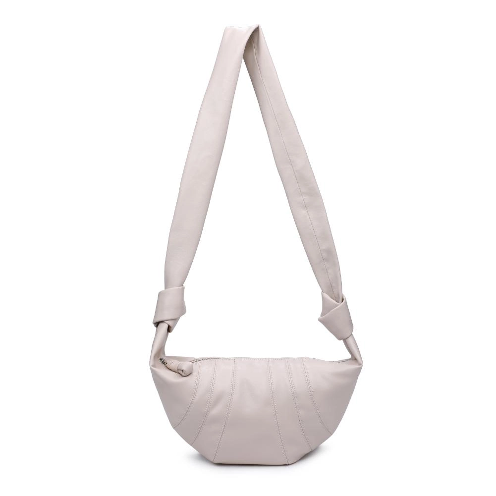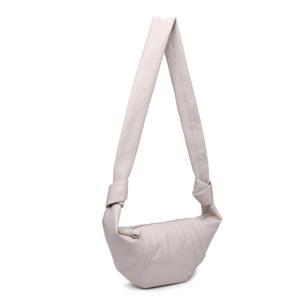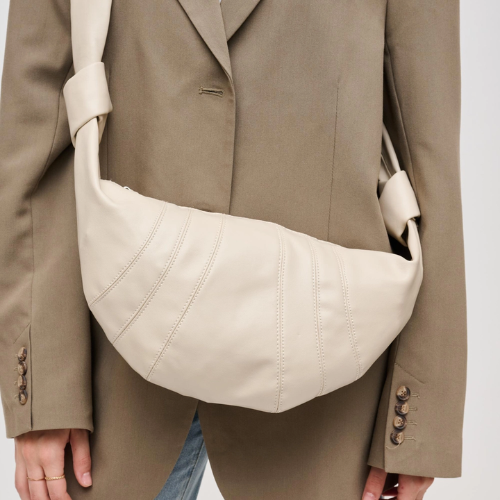 Experience effortless sophistication with this croissant-shaped vegan leather crossbody. Designed with detailed stitching and a one-of-a-kind knotted strap, this bag effortlessly blends fashion with practicality. The inside is lined with printed fabric and boasts a zip pocket and slip pocket, keeping all your essentials neatly in place.