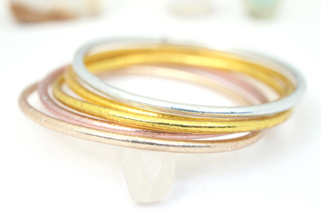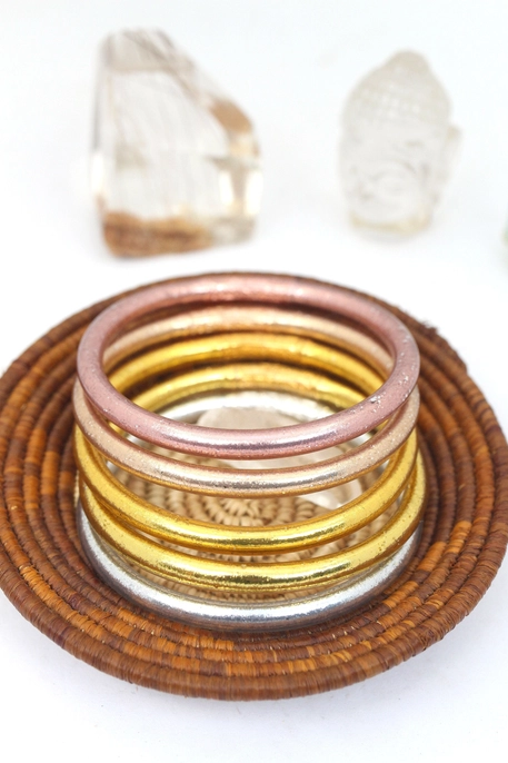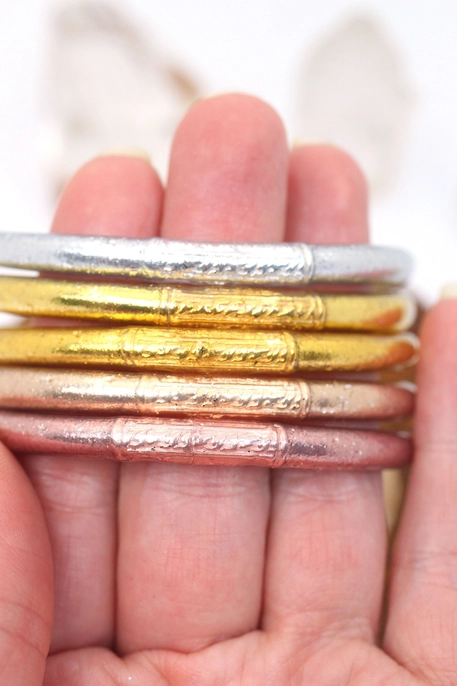 Radiant and glowing, these bracelets are temple bracelets from Thailand. They are filled with the gold flake that is used on the Buddhas outside temples. Just like the Buddhas, these might change color over time with wear.
