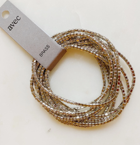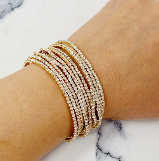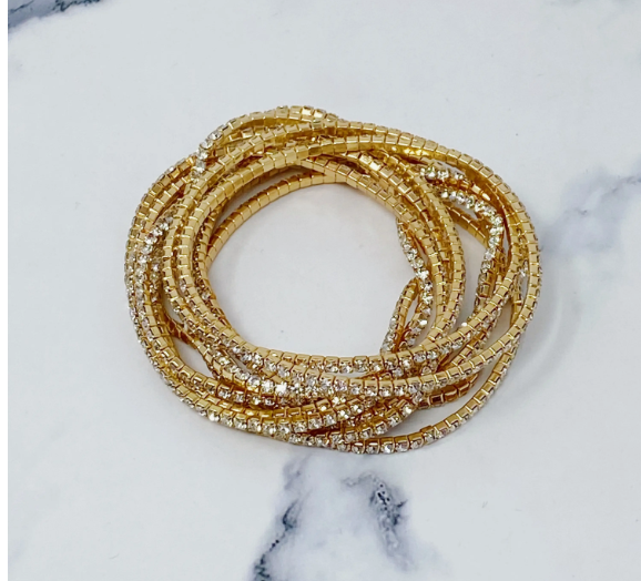 The perfect layered bracelet set! Beautiful golden cubic zirconia detailing. 11 dainty stretch bracelets come together in this set. Can be worn all together or with just the right amount of shine you like to have for the day or the occasion!