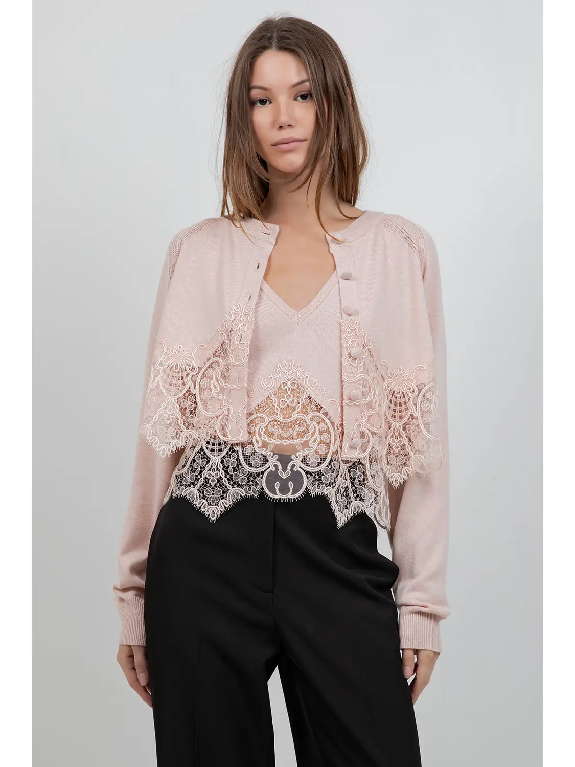 A thoughtful blend of polyester, acrylic, nylon, and wool gives this cardigan its gentle structure and cozy drape, while the 100% polyester lace edging adds a refined, feminine touch that elevates even the simplest of looks.