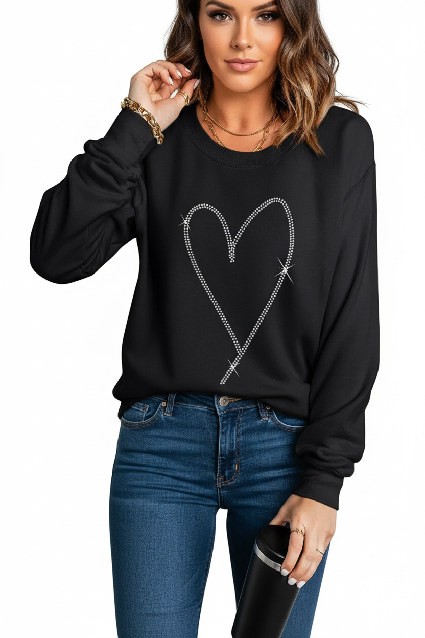 Black Rhinestone Heart Pattern Sweatshirt