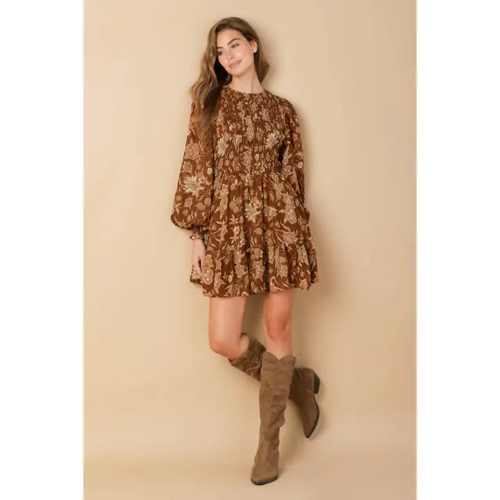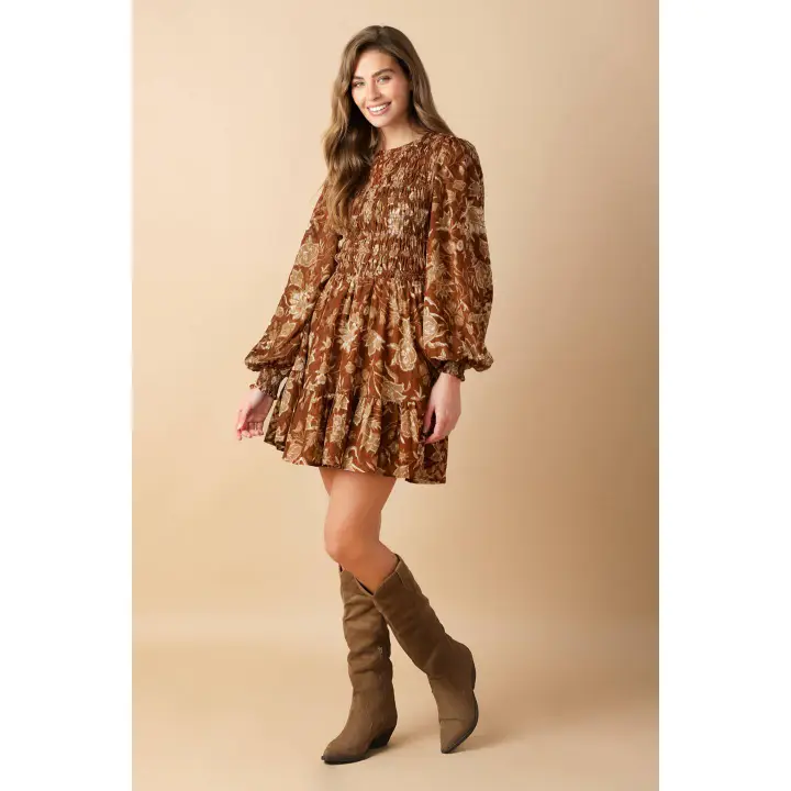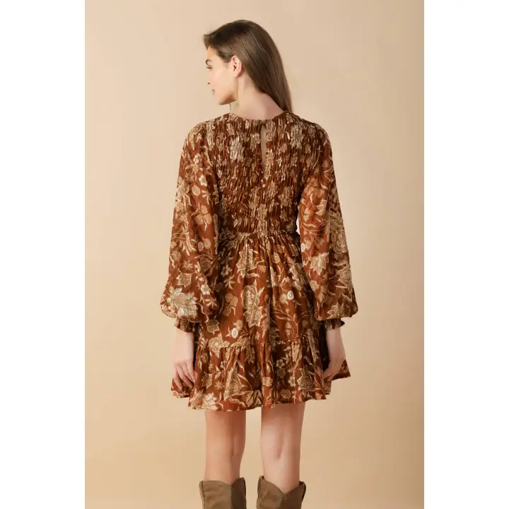 Stunning printed woven mini dress featuring round neckline, smocked front and back bodice, long sleeve with smocked cuff, tiered skirt and back neck button closure.
