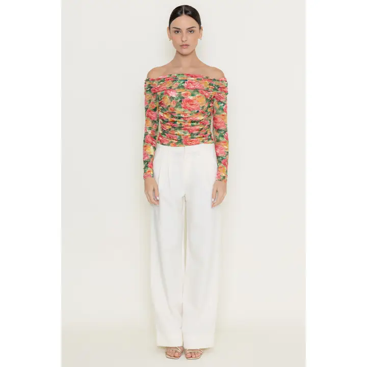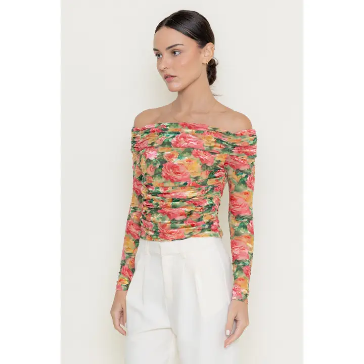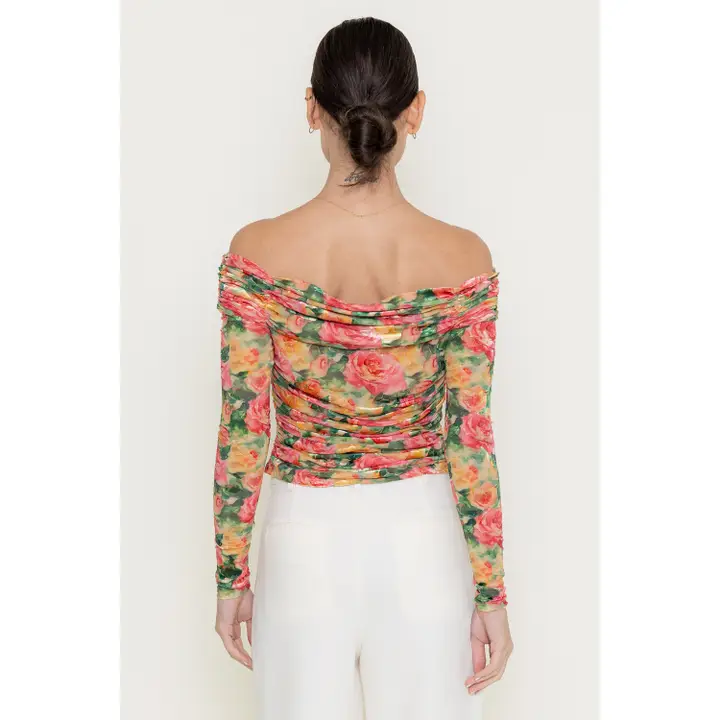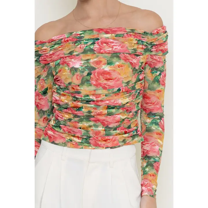 Girl core romantic rose floral long sleeve off the shoulder top with ruching, romantic rose floral print, semi cropped length and vibrant colors. Perfect for a day party or a garden party.