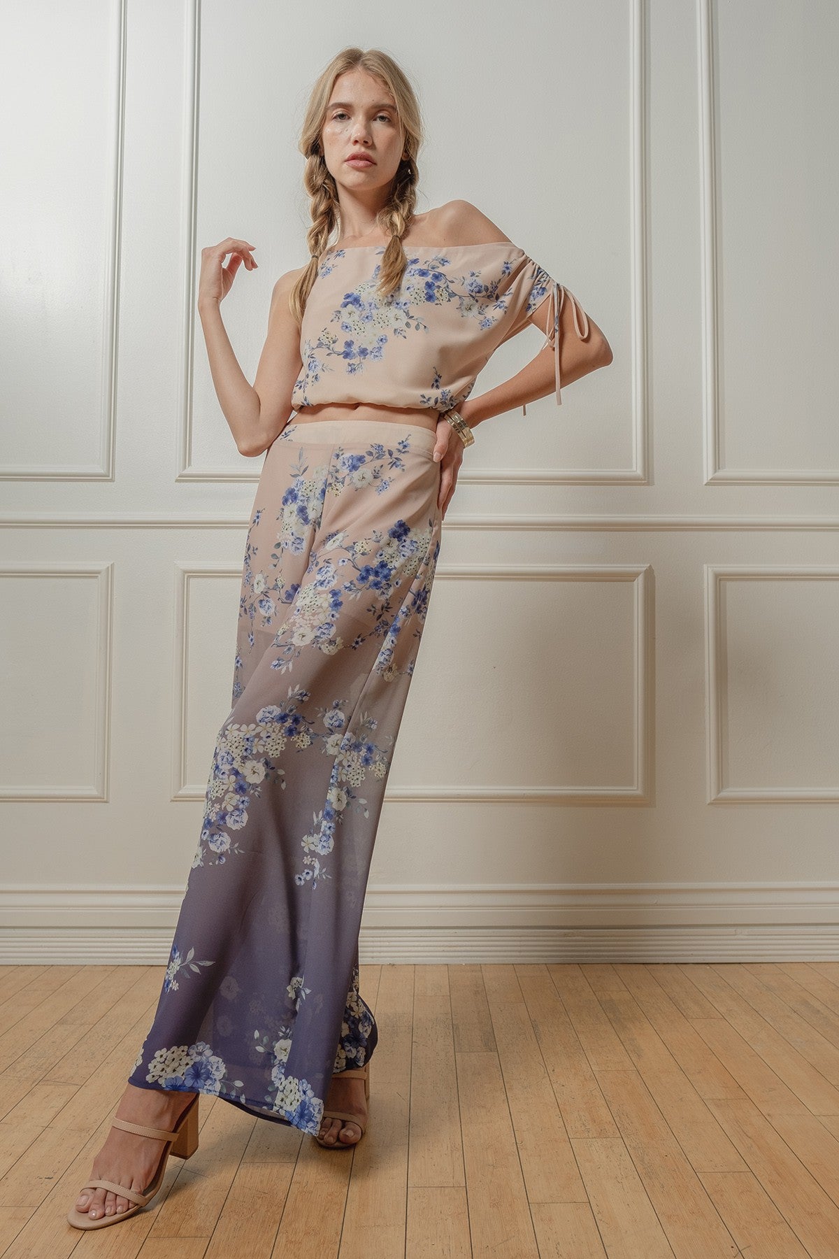 Floral Print Top and Pants Set. Asymmetrical Cropped Top with Ruched Drawstring Tie Paired with Wide Leg Pants.
