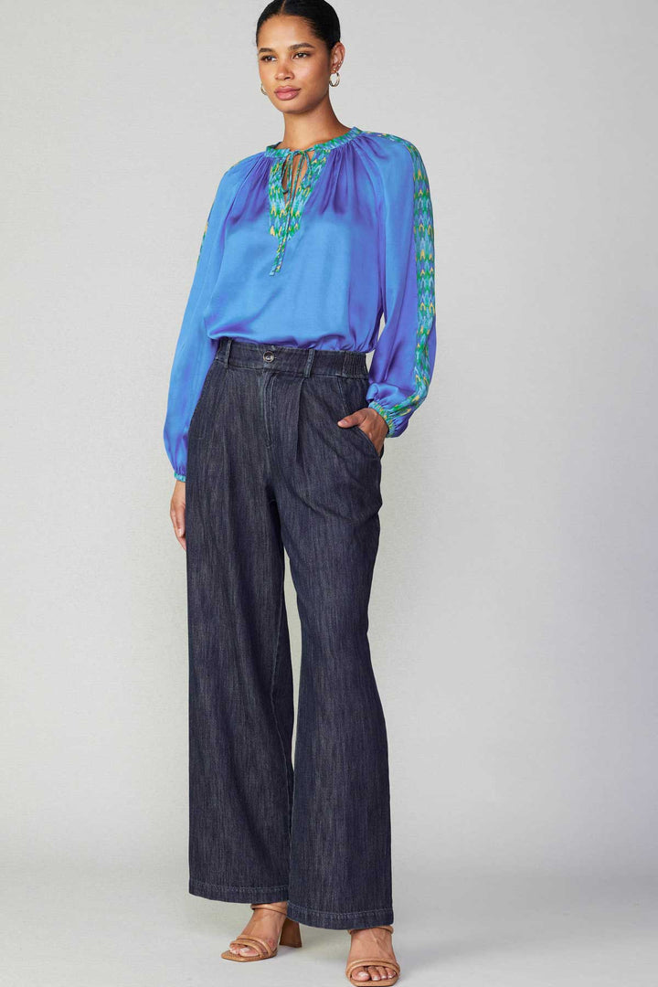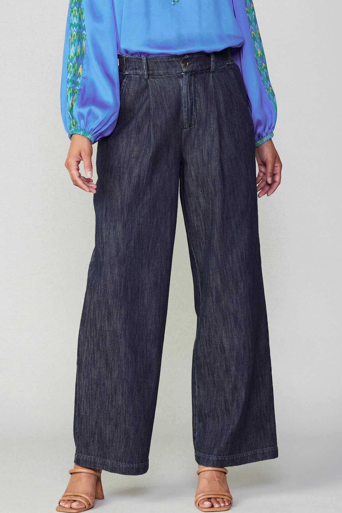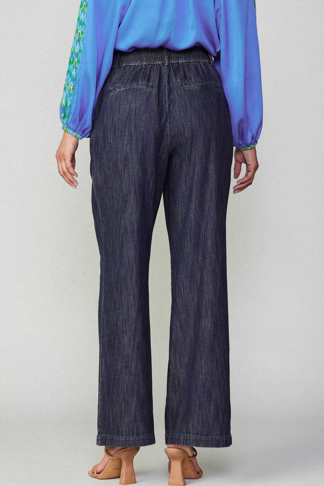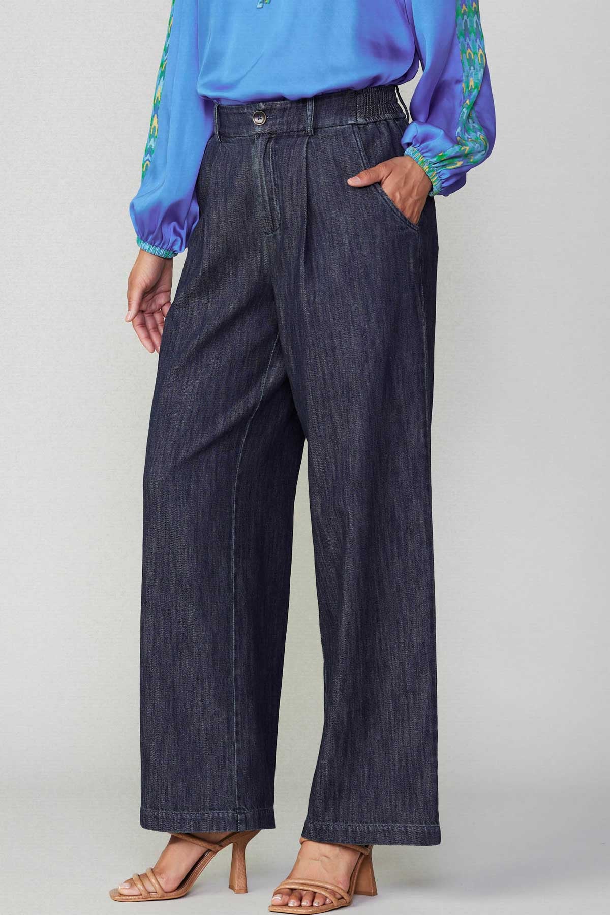 Pleated Denim Wide Leg Pants with Back Elasticized Waist and Back Welt Pocket