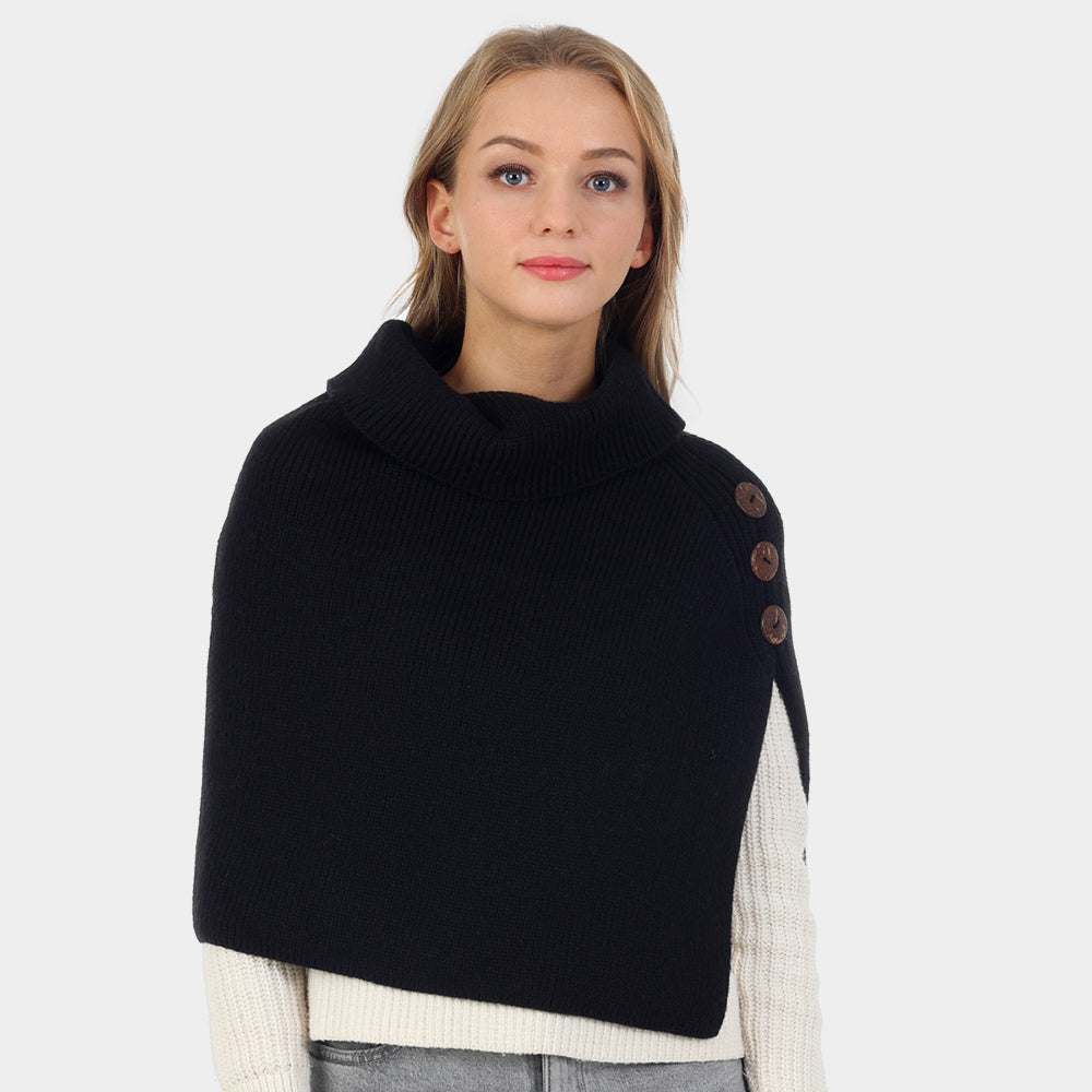 - Gorgeous and timeless black poncho with wooden buttons! Style casually or dress up. Perfect to throw over!