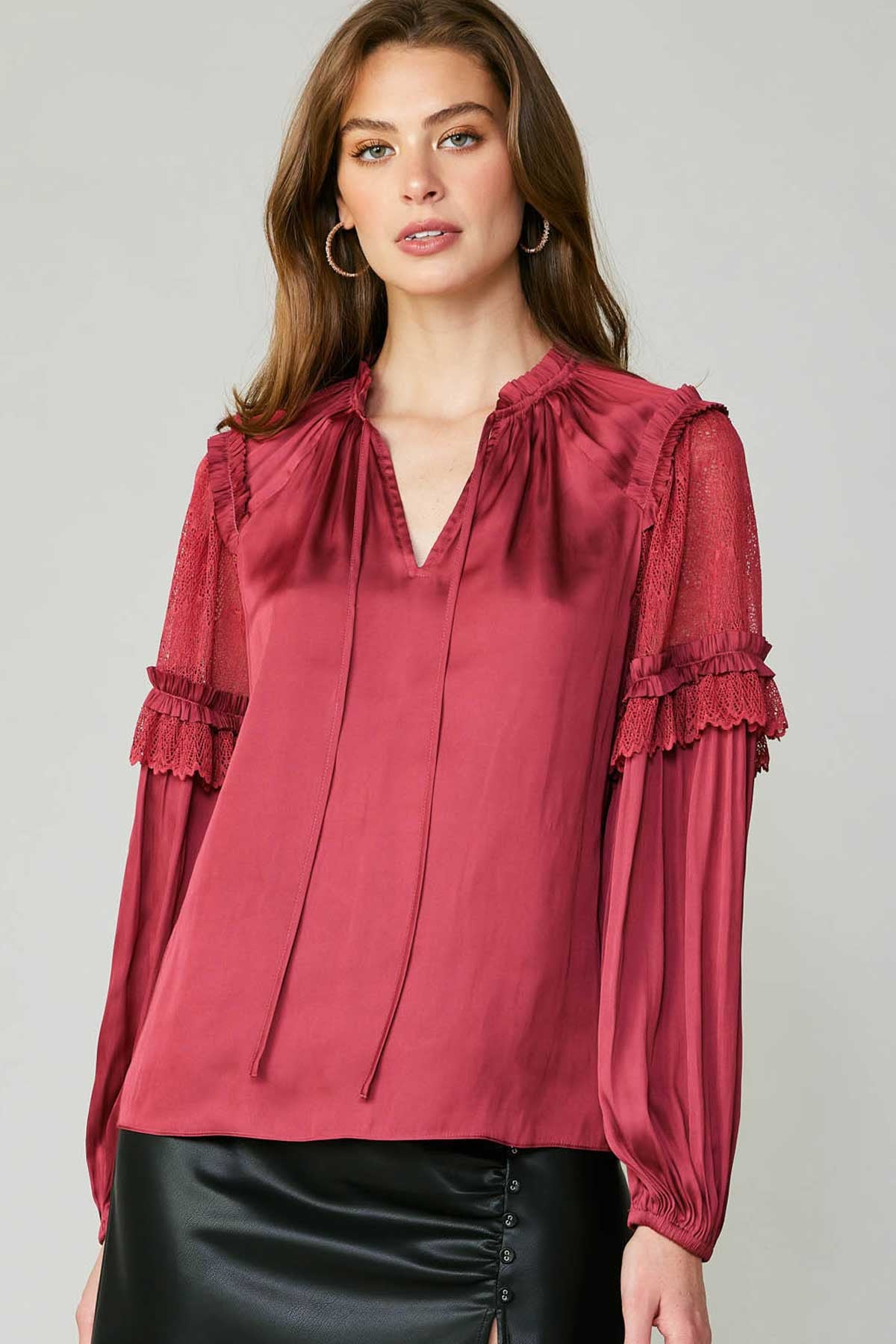 In a stunning shade of "raspberry," this top is incredibly soft and luxurious against the skin. With a flowing fit that moves gracefully as you walk, the delicate lace sleeve detail adds a touch of elegance and sophistication, making this blouse truly unique and elevated.