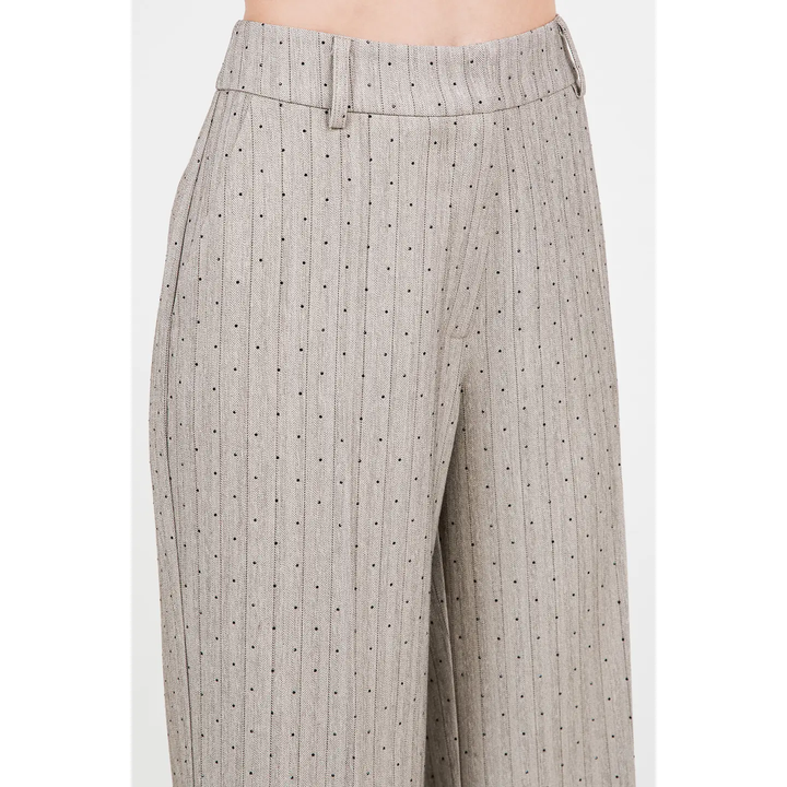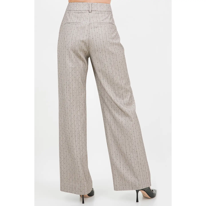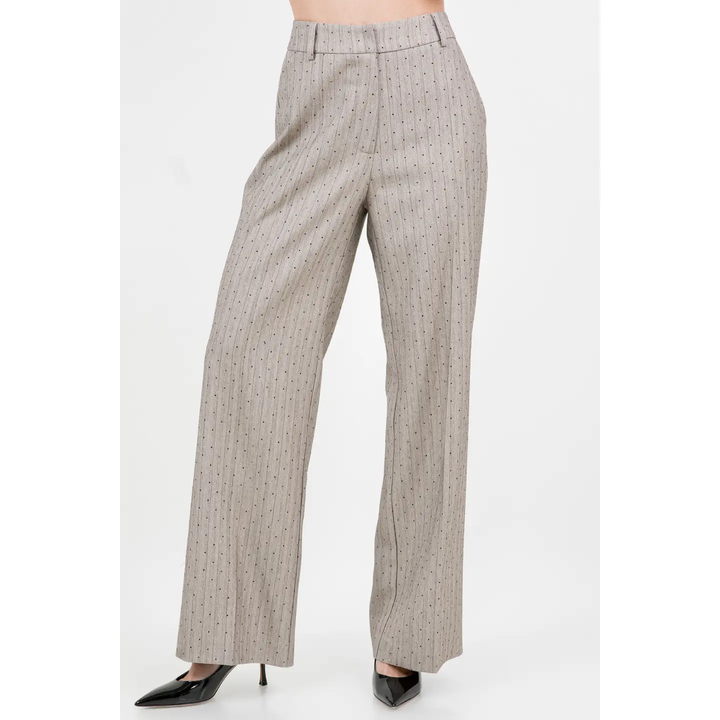 Dress to impress with these stunning trousers! The rhinestone embossing adds a touch of glamour, while the pinstripe pattern elongates your legs for a flattering silhouette. Perfect for any occasion, these straight leg trousers will elevate any outfit and make you feel confident and elegant. Wear with the sexy, yet classy Rhinestone Embossed Pinstripe Top!